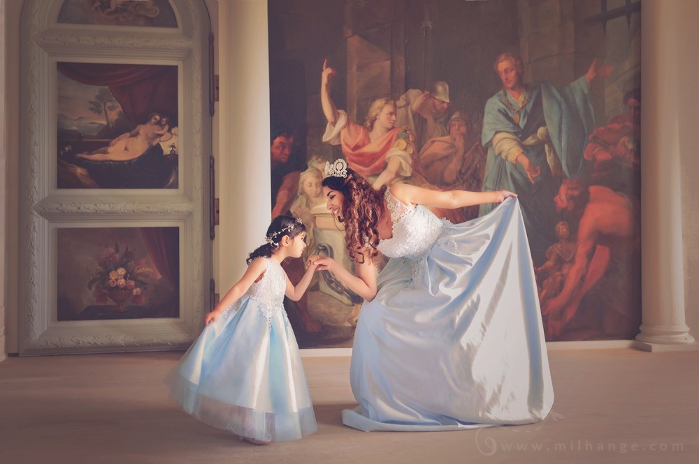 Shooting mère et fille au château Vinci avec les robes d’Ambrine collection Bordeaux.