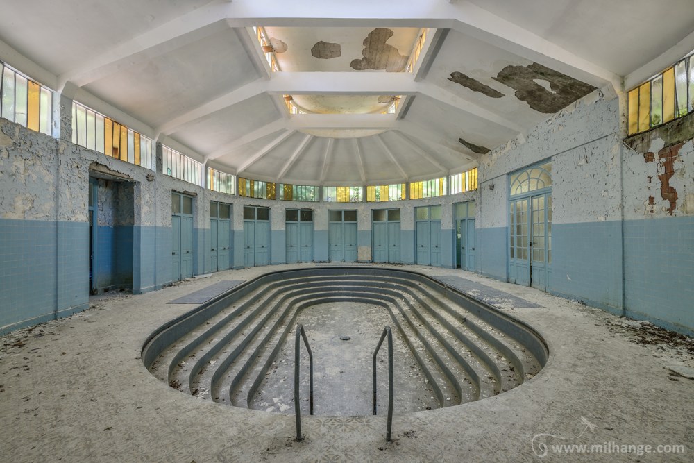 Des décennies d’abandon ont laissé des traces. Il y a bien longtemps que le docteur a déserté son cabinet et que l’eau ne sort plus par les tuyaux pour masser et détendre les corps endoloris des curistes. Aujourd’hui, l’eau de l’ancienne source s’infiltre par le sol et ronge le bâtiment des murs jusqu’au plafond. Les thermes bleus perdent tranquillement leur couleur d’azur…